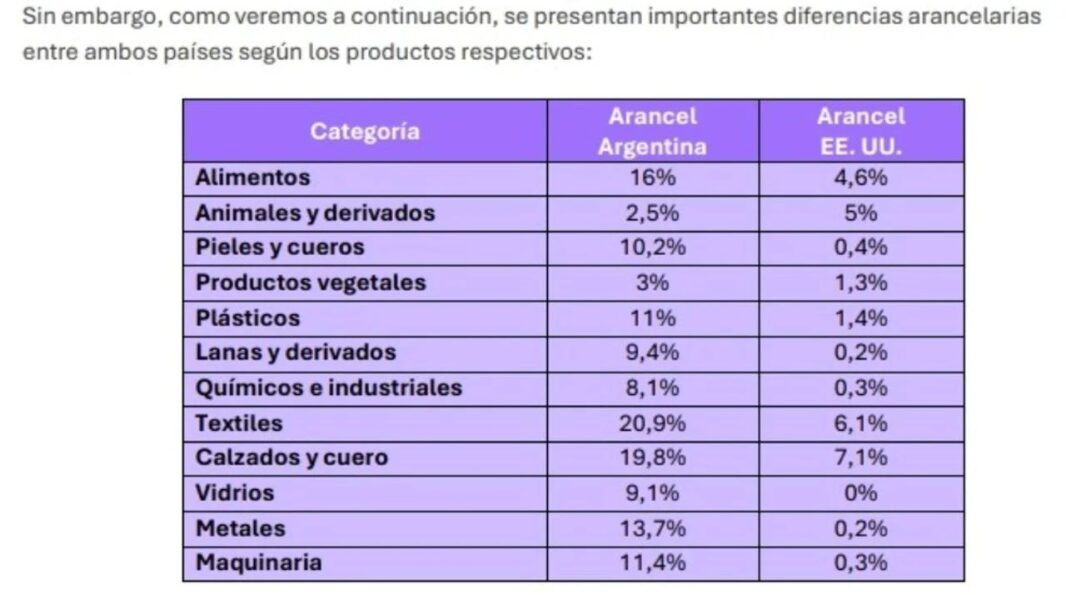 En cuanto a los aranceles, en algunos casos Estados Unidos no cobra por las exportaciones argentinas, como en el caso de productos eléctricos, mientras que la Argentina cobra 8,8% a las exportaciones del gigante americano.