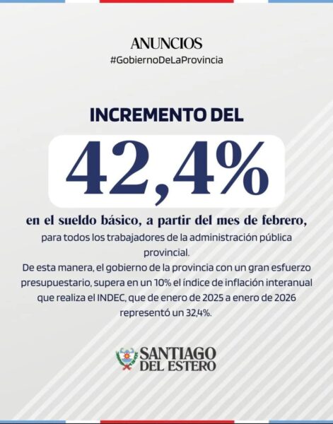 1.Incremento salarial del 42,4% en el sueldo básico, a partir del mes de febrero, para todos los trabajadores de la administración pública provincial. De esta manera, el gobierno de la provincia con un gran esfuerzo presupuestario, supera en un 10% el índice de inflación interanual que realiza el INDEC, que de enero de 2025 a enero de 2026 representó un 32,4%.