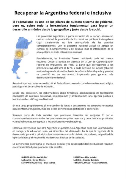 El documento lleva la firma de Axel Kicillof (Buenos Aires), Sergio Ziliotto (La Pampa), Elías Suárez (Santiago del Estero), Gildo Insfrán (Formosa), Ricardo Quintela (La Rioja) y Gustavo Melella (Tierra del Fuego), quienes coincidieron en que otra Argentina es posible, con la producción, el trabajo y la educación como pilares del desarrollo y con una democracia plena que garantice igualdad de oportunidades y respeto por los derechos básicos.