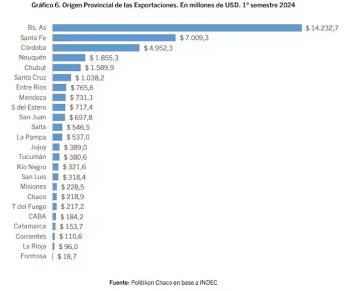 Durante los primeros seis meses de 2024, esta provincia exportó por US$718 millones, un incremento del 74,3% con respecto al primer semestre de 2023. Significó el 1,9% del total nacional y el 31,4% de los envíos al exterior de la región del NOA. En la tabla de posiciones nacional Santiago del Estero ocupó el noveno lugar, con el podio siempre a manos de la provincia de Buenos Aires, Santa Fe y Córdoba, en ese orden, con US$14.232,7 millones, US$7009,3 millones y US$4952,3 millones, respectivamente. Son datos de Politikon en base al Indec.
