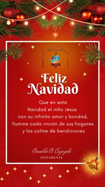 “El intendente Arnaldo ‘Beto’ Cazazola les envía sus mejores deseos en esta Navidad, que el Niño Jesús, con su inmenso amor y bondad, ilumine sus hogares y los colme de felicidad, unión y bendiciones”, fueron las palabras publicadas por la cuenta de la comuna citando al jefe comunal.