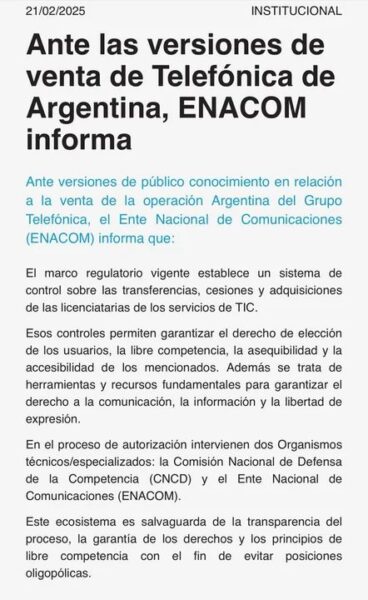Ante versiones de público conocimiento en relación a la venta de la operación Argentina del Grupo Telefónica, el Ente Nacional de Comunicaciones (ENACOM) informa que: