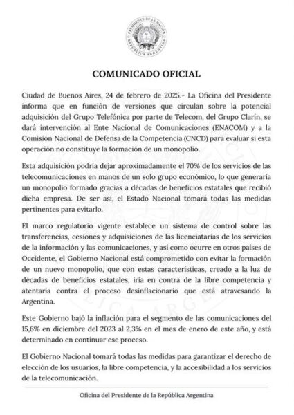 Ciudad de Buenos Aires, 24 de febrero de 2025.- La Oficina del Presidente informa que en función de versiones que circulan sobre la potencial adquisición del Grupo Telefónica por parte de Telecom, del Grupo Clarín, se dará intervención al Ente Nacional de Comunicaciones (ENACOM) y a la Comisión Nacional de Defensa de la Competencia (CNCD) para evaluar si esta operación no constituye la formación de un monopolio.