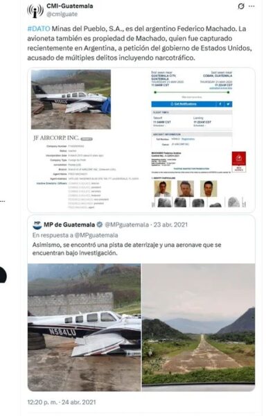 El tuit clave, que data de mayo de 2020, proviene de la cuenta CMI-Guatemala (@cmiguate), que en su biografía se define como un medio dedicado al “Mapeo de redes de poder” y parte de la red global de Indymedia. La publicación es contundente: “#DATO Minas del Pueblo, S.A., es del argentino Federico Machado. La avioneta también es propiedad de Machado, quien fue capturado recientemente en Argentina, a petición del gobierno de Estados Unidos, acusado de múltiples delitos incluyendo narcotráfico”.