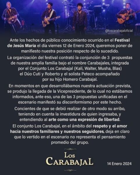 “En el escenario hubo tres propuestas de nuestra amplia familia bajo el nombre Carabajales -Los Carabajal, el Dúo Cuti y Roberto y Peteco acompañado de su hijo Homero-, en momentos del arrbo de la Vicepresidente, del cual no estábamos informados, una de las tres propuestas manifestó su disconformidad con lo sucedido”, reza el comunicado.