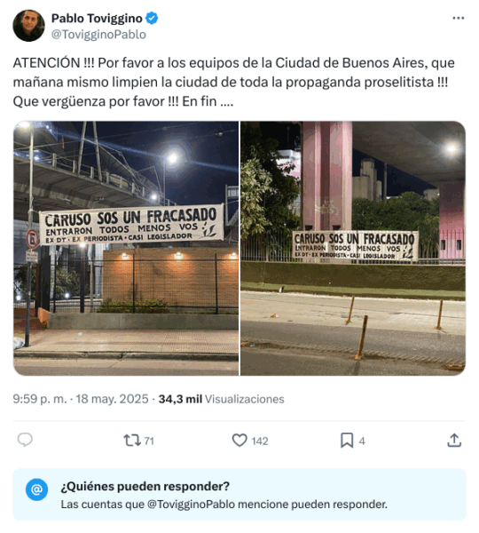 Ante esto, el tesorero de AFA esperó el resultado de los comicios y, a las 10 de la noche, subió un posteo en el que pidió a los equipos de la Ciudad de Buenos Aires que “mañana mismo limpien la ciudad de toda la propaganda proselitista”, agregando “¡qué vergüenza, por favor!” al mismo tiempo que compartía las imágenes de ambos pasacalles.
