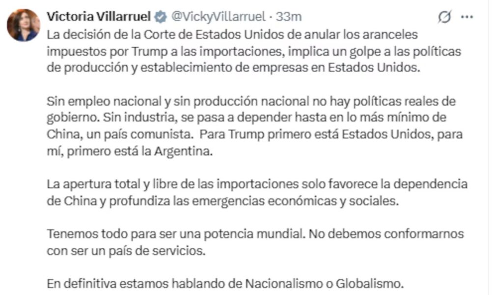 “Para Trump primero está Estados Unidos; para mí, primero está la Argentina”, sentenció Victoria Villarruel en un movimiento que volvió a sacudir la interna oficialista. Las declaraciones de la Vicepresidenta tuvieron lugar tras el fallo de la Corte Suprema de EE.UU. que anuló los aranceles recíprocos impuestos por Donald Trump.